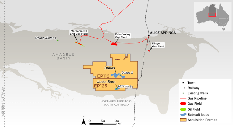 This permit contains a variety of structural styles, and several leads have been identified from potential field data and the extensive 2013 regional seismic program. Seismic acquired in 2013/14 and 2016/2018 identified the giant Dukas prospect at basement level. The Dukas-1 well was drilled in mid-April 2019 targeting natural gas and helium from the Heavitree Formation, which flowed at sub-commercial rates from Magee 1. Drilling was suspended due to extremely high pressures before penetration of the Heavitree Formation or basement. Drilling mud samples indicate the presence of hydrocarbons and helium. This permit contains a variety of structural styles, and additional Heavitree Formation/fractured basement leads (Sculthorpe, Beethoven, Grainger, Percy, Mozart) have been identified from potential field data as well as the previous seismic programs. A second Dukas well is being planned.